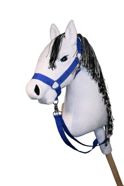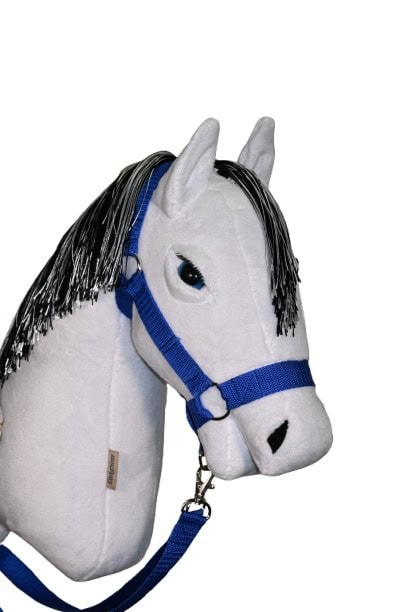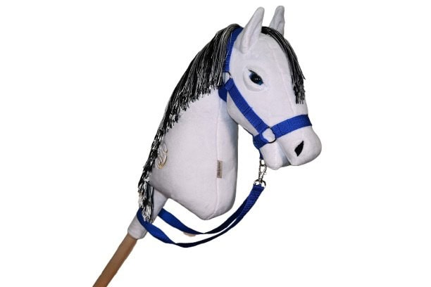 Fehér színű DorkaHorse vesszőparipa, plüss anyagból, fekete-fehér sörénnyel, kék színű szemekkel, szempillával, szárral és kötőfékkel.