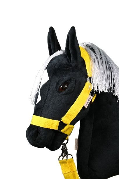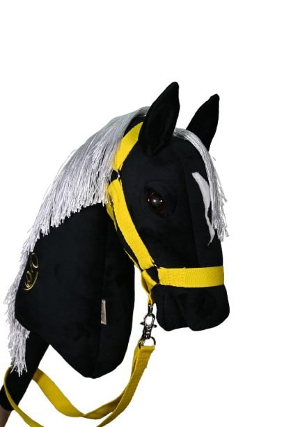 Fekete színű DorkaHorse seprűnyél ló plüss anyagból, fehér sörénnyel, borostyán színű szemekkel, szempillával, szárral és kötőfékkel.