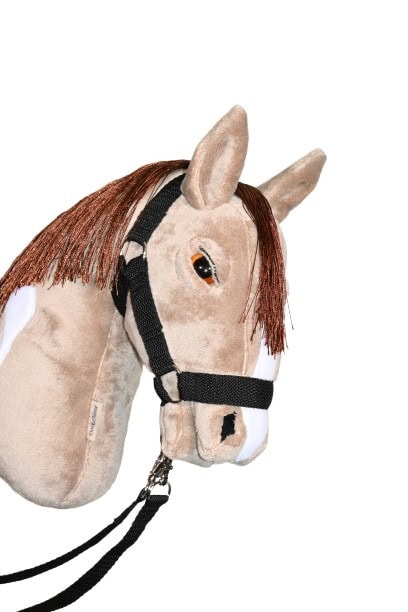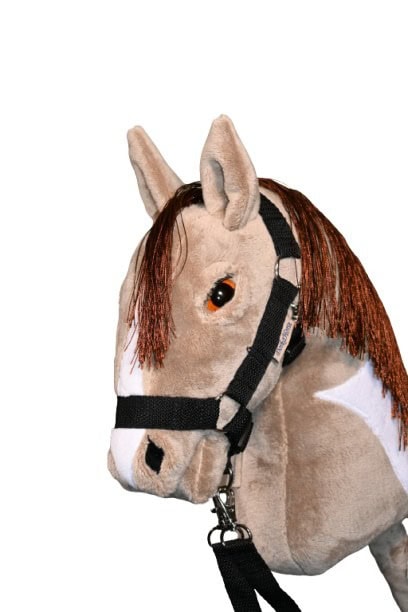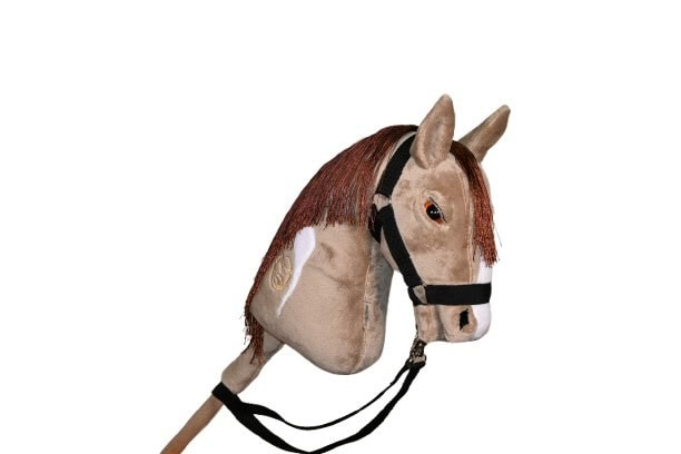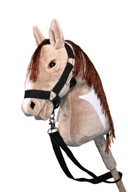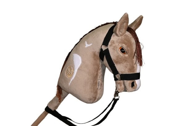 Mogyoró színű Mini DorkaHorse seprűnyél ló fehér foltokkal, barna sörénnyel, borostyán színű szemekkel, szempillával, szárral és kötőfékkel. A termék kisebb méretű, kb. 35*26*11 cm, tömege kb. 600 g. A rövidebb nyélnek köszönhetően könnyebb, a ló feje néhány cm-rel kisebb a normál méretű termékeinknél. Versenyekre ideális méret.
