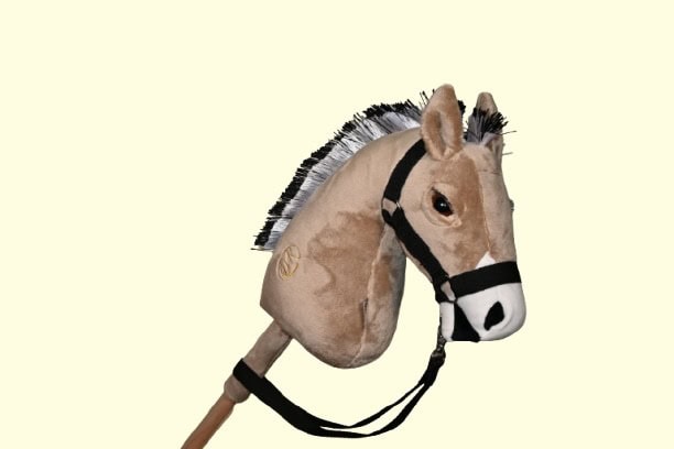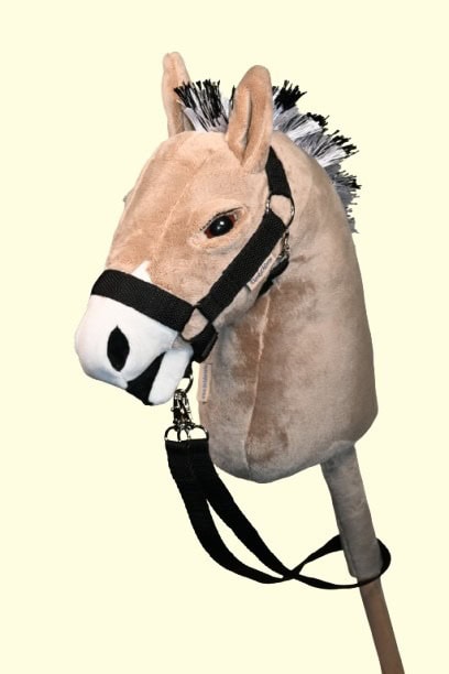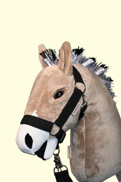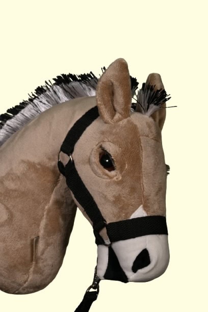 Mogyoró színű DorkaHorse seprűnyél ló, Fjord mintájára készült, plüss anyagból, fekete-fehér sörénnyel, barna színű szemekkel, szempillával, szárral és kötőfékkel.