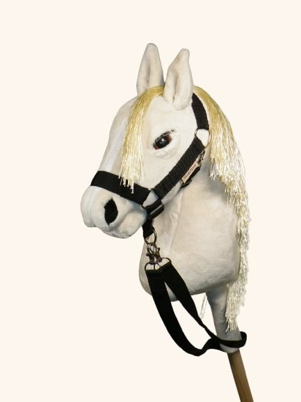 DorkaHorse csikó, világos drapp seprűnyél ló, aranysárga sörénnyel, hókával, barna színű szemekkel, szempillával, szárral és kötőfékkel. A termék kisebb méretű, kb. 35*26*11 cm, tömege kb. 600 g. A rövidebb nyélnek köszönhetően könnyebb, a ló feje néhány cm-rel kisebb a normál méretű termékeinknél. Versenyekre ideális méret.